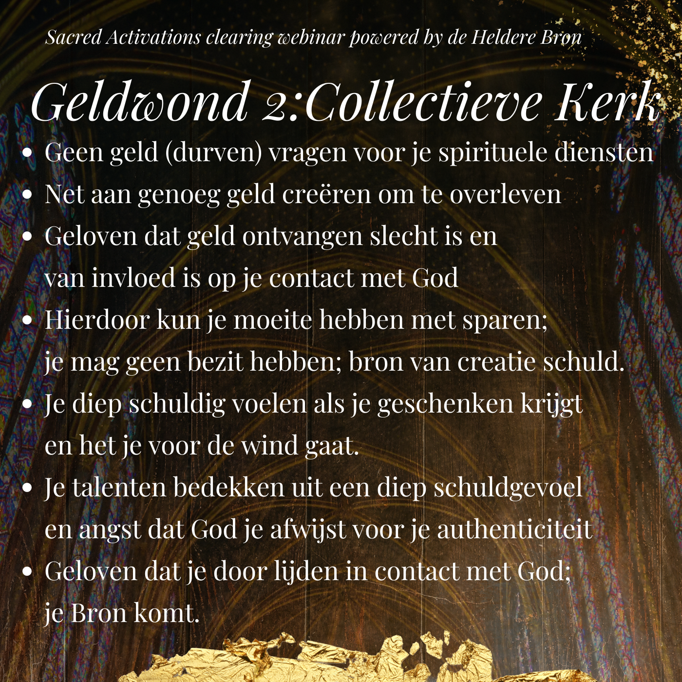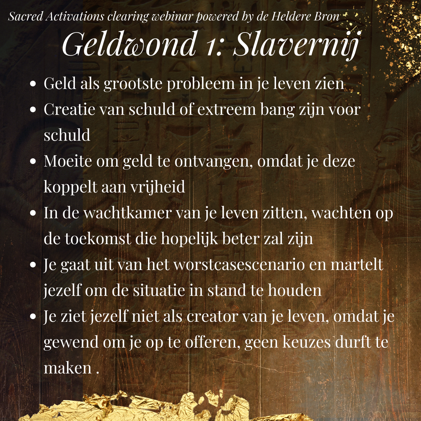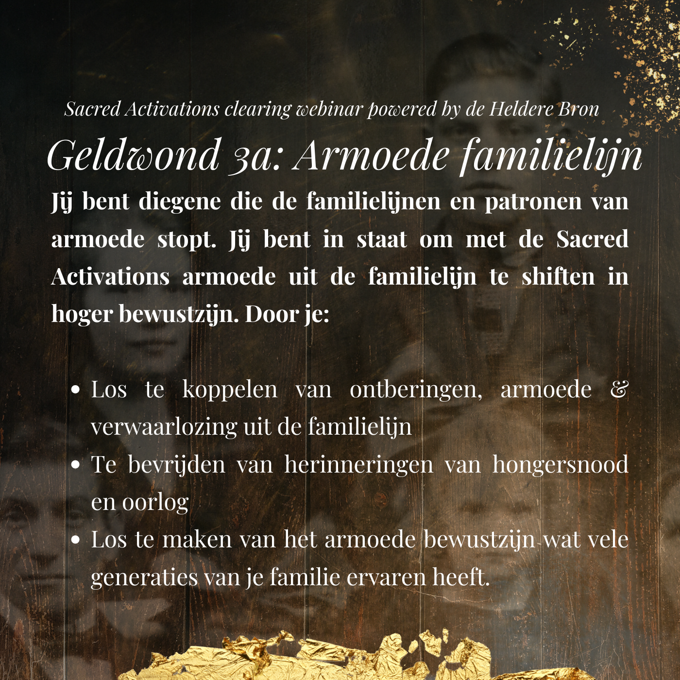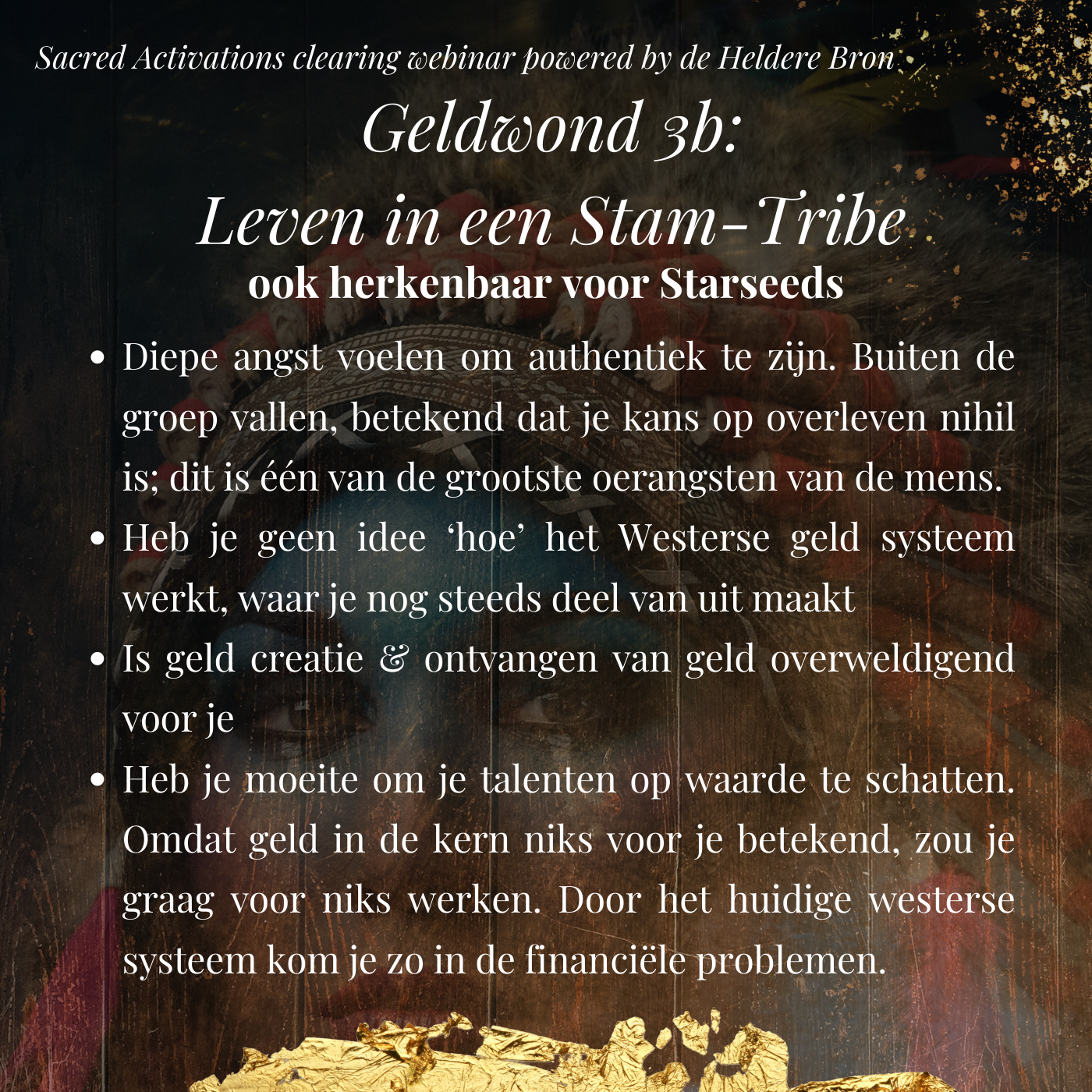 De calling voor de creatie van dit webinar was heel sterk en steeds terugkerend. Het moment is nu voor jou als Lichtwerkers, Starseed en of Oude Ziel om die Sacred Activations en clearings te ontvangen die je zal bevrijden van zo veel onbewuste en verborgen implantaten, ketens en geloften van Armoede door vele levens heen. Deze herinneringen liggen opgeslagen in het cellulair geheugen van je cellen en saboteren onnodig je toegang tot alle versies van overvloed. De Sacred Activations hier beschreven zijn om een beeld te geven, de werkelijke set zal doorkomen zo'n 24 uur voor het clearing webinar.