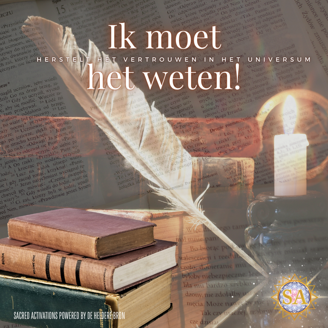 Dit patroon wordt geactiveerd door je angst voor het onbekende, de verloren verbinding met je eigen bron en je ego die je vertelt dat je niet genoeg weet. Met de Sacred Activation “Ik moet het weten”, worden deze angsten en overtuigingen gecleared en krijg je het vertrouwen in je eigen Bron en je leven terug. Het is weten dat je altijd veilig bent, waar je ook heen geleid wordt en dat Creator altijd achter je staat.